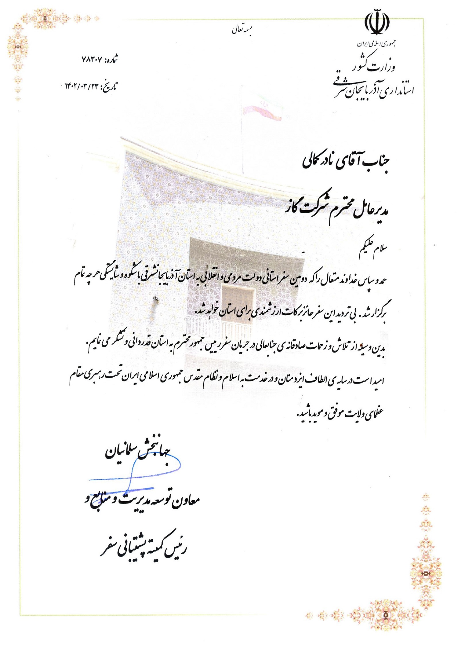 بدین وسیله از تلاش و زحمات صادقانه جنابعالی در جریان سفر رئیس جمهور محترم به استان قدردانی و تشکر می نمایم.....