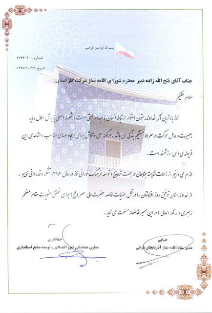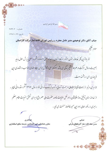 شرکت گاز استان آذربایجان شرقی به جهت ترویج و توسعه  فرهنگ نورانی نماز برای چهارمین سال متوالی شایسته تقدیر شد