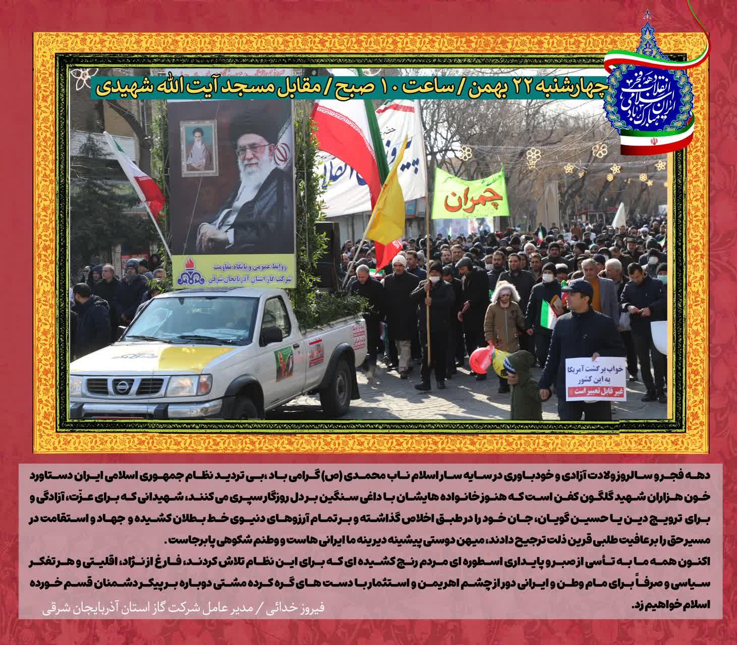 شرکت گاز استان آذربایجان شرقی همزمان با سالروز پیروزی انقلاب اسلامی طی بیانیه ای حضور خود را در صحنه های انقلاب اسلامی اعلام کرد.