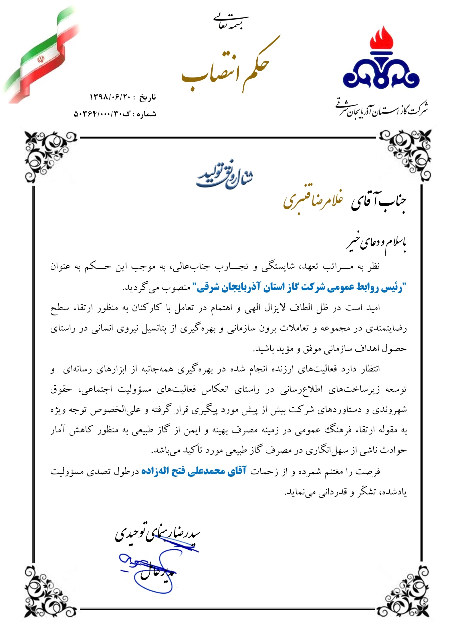 به گزارش روابط عمومی شرکت گاز استان آذربایجان شرقی، مدیرعامل این شرکت طی حکمی غلامرضا قنبری را به عنوان رئیس جدید روابط عمومی منصوب و از زحمات محمدعلی فتح اله زاده رئیس سابق این واحد تقدیر نمود.