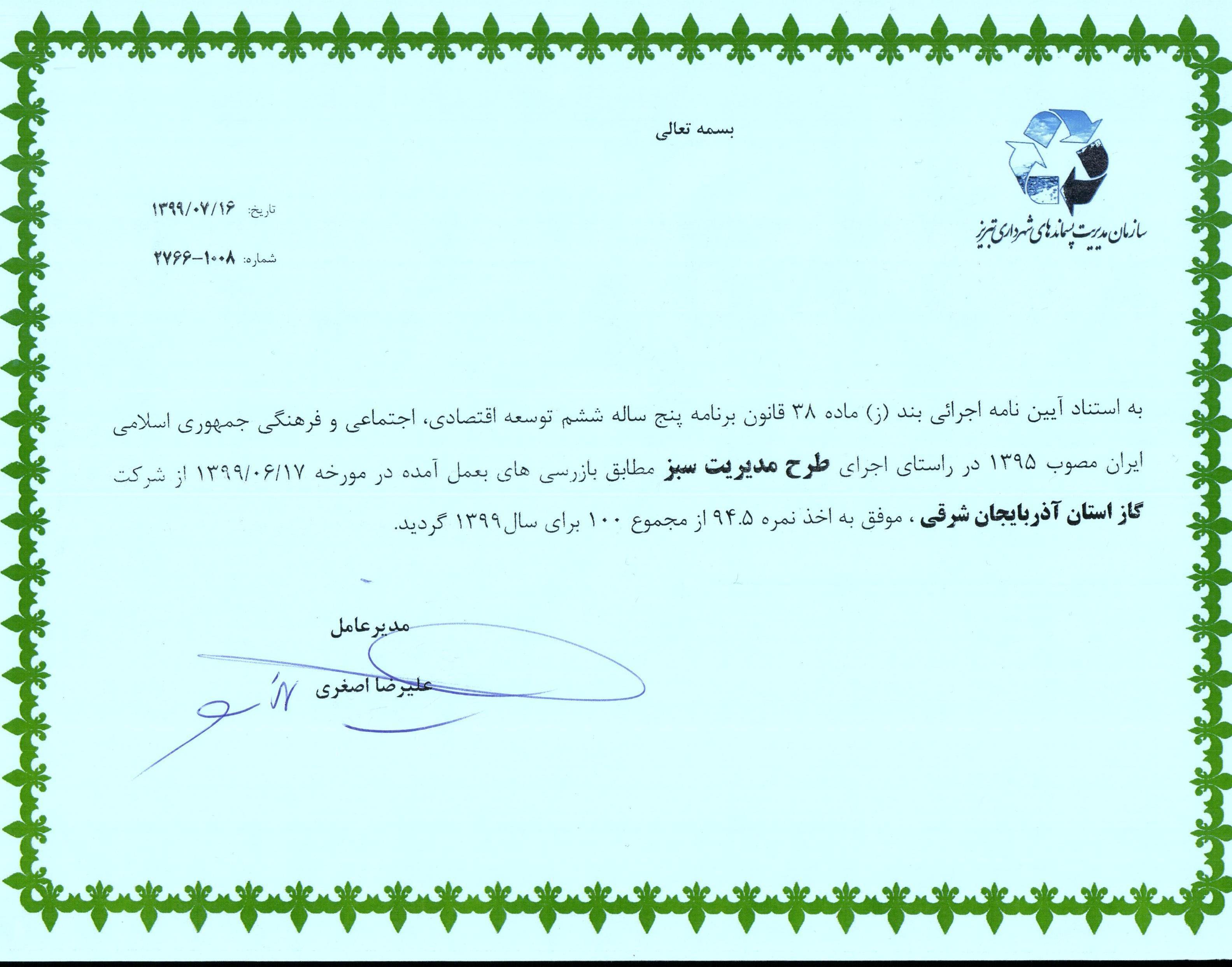 شرکت گاز موفق به کسب گواهینامه مدیریت پسماند با اخذ امتیاز ممتاز در سطح دستگاه های اجرایی استان آذربایجان شرقی گردید.