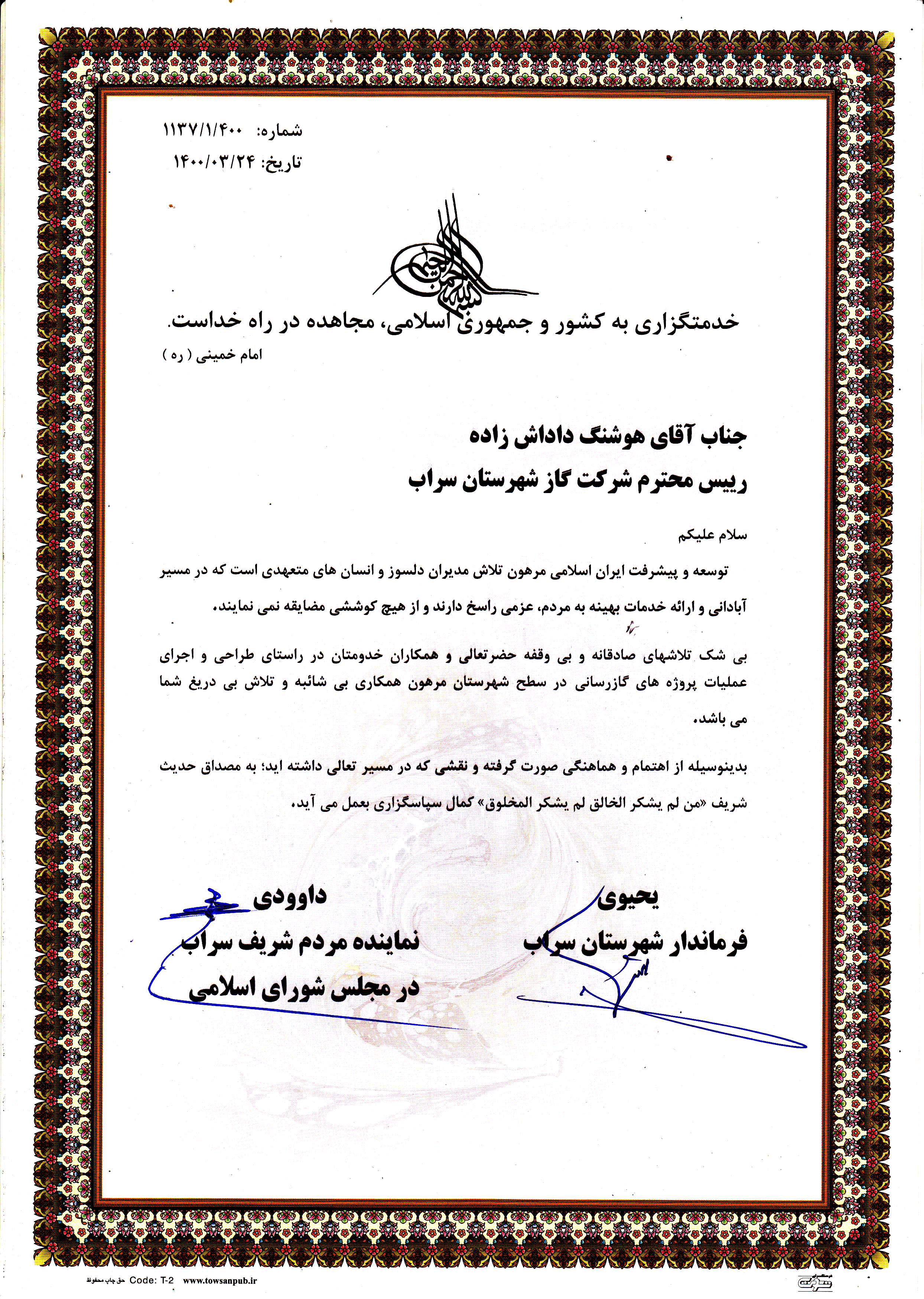 هوشنگ داداش زاده، رئیس اداره گاز شهرستان سراب از سوی نماینده مردم این شهرستان در مجلس شورای اسلامی و فرماندار شهرستان مورد تقدیر قرار گرفت.