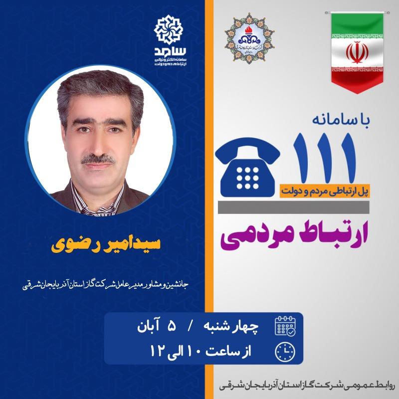 جانشین و مشاور مدیرعامل شرکت گاز استان آذربایجان شرقی، روز چهارشنبه تاریخ ۵ آبان ماه ۱۴۰۰ از ساعت ۱۰ الی ۱۲ با حضور در سامانه ارتباط مردمی سامد، پاسخگوی درخواست های مردمی در حوزه گازرسانی استان خواهد بود.